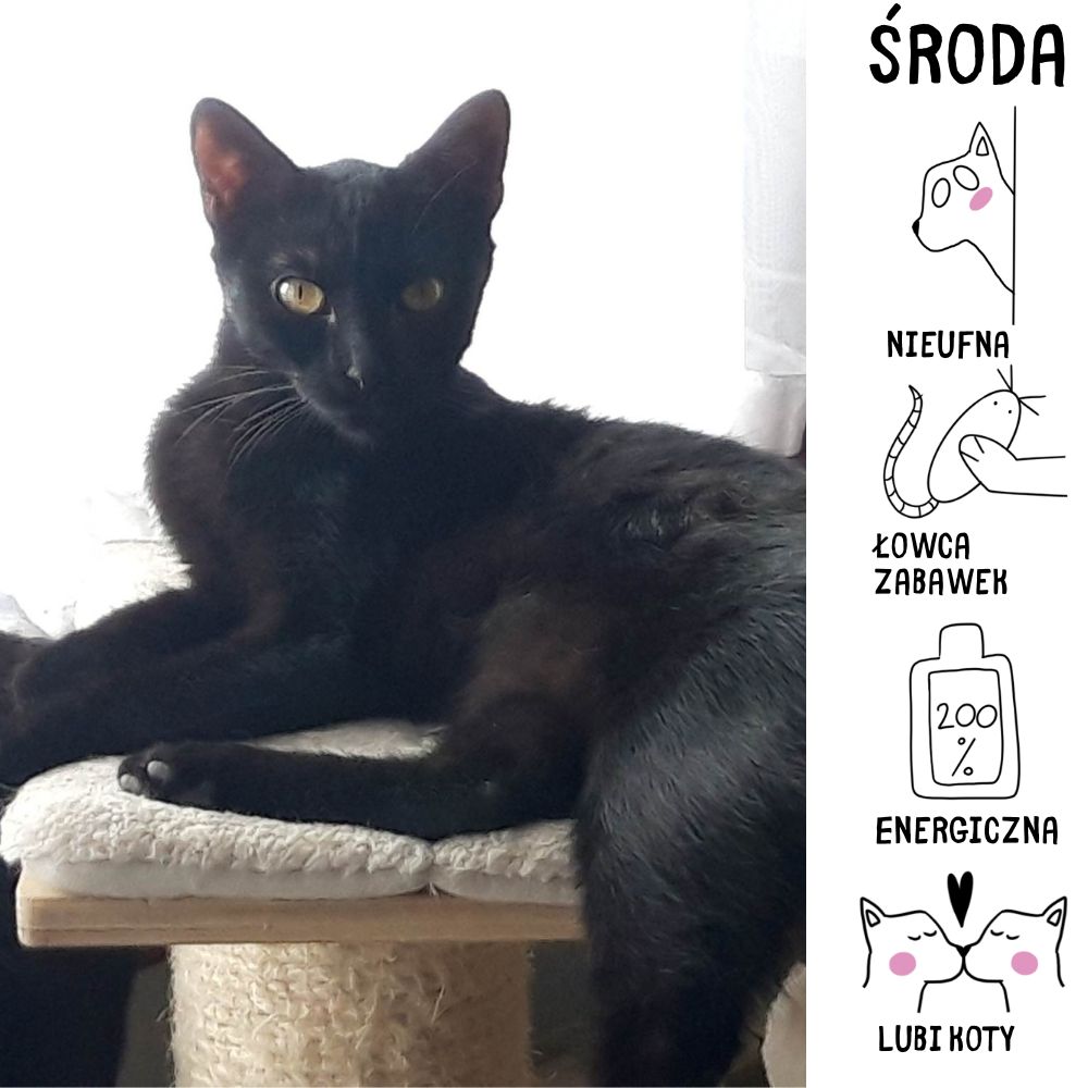 Środa to kotka, która na świat przyszła na początku lipca 2022 roku, a trafiła do nas 24 sierpnia 2022 roku po tym jak była wyłapywana wraz z rodzeństwem na terenie Śląskiego Uniwersytetu Medycznego przy ul. Jordana. Niestety to już kolejny miot, który do nas stamtąd trafił i kolejny miot, który ma ogromnego pecha... Kociaki stamtąd mają duży problem z oswojeniem się cudownie dogadują się z innymi kotami, natomiast od człowieka trzymają się na dystans, a szczególnie obcego, czyli potencjalne osoby zainteresowane ich adopcją nawet nie za bardzo mają jak je zobaczyć. Środa to już w ogóle mały pechowiec, bo początkowo bardzo dużo chorowała, przez co długo nie pojawiała się na naszej stronie, a kiedy już wyzdrowiała to gdzieś umknęło dodanie jej zdjęcia i opisu, chociaż chyba niewiele to zmieniło, bo jej rodzeństwo na naszej stronie jest od wielu miesięcy i zupełnie nikt się nimi nie interesuje :-( Jest wesołym i aktywnym kotem, kiedy jest ciepło, chętnie spędza czas na osiatkowanym balkonie. W domu tymczasowym, w którym mieszka przebywa z innymi kotami i psami, dlatego jak najbardziej mogłaby zamieszkać w domu z innymi zwierzakami.