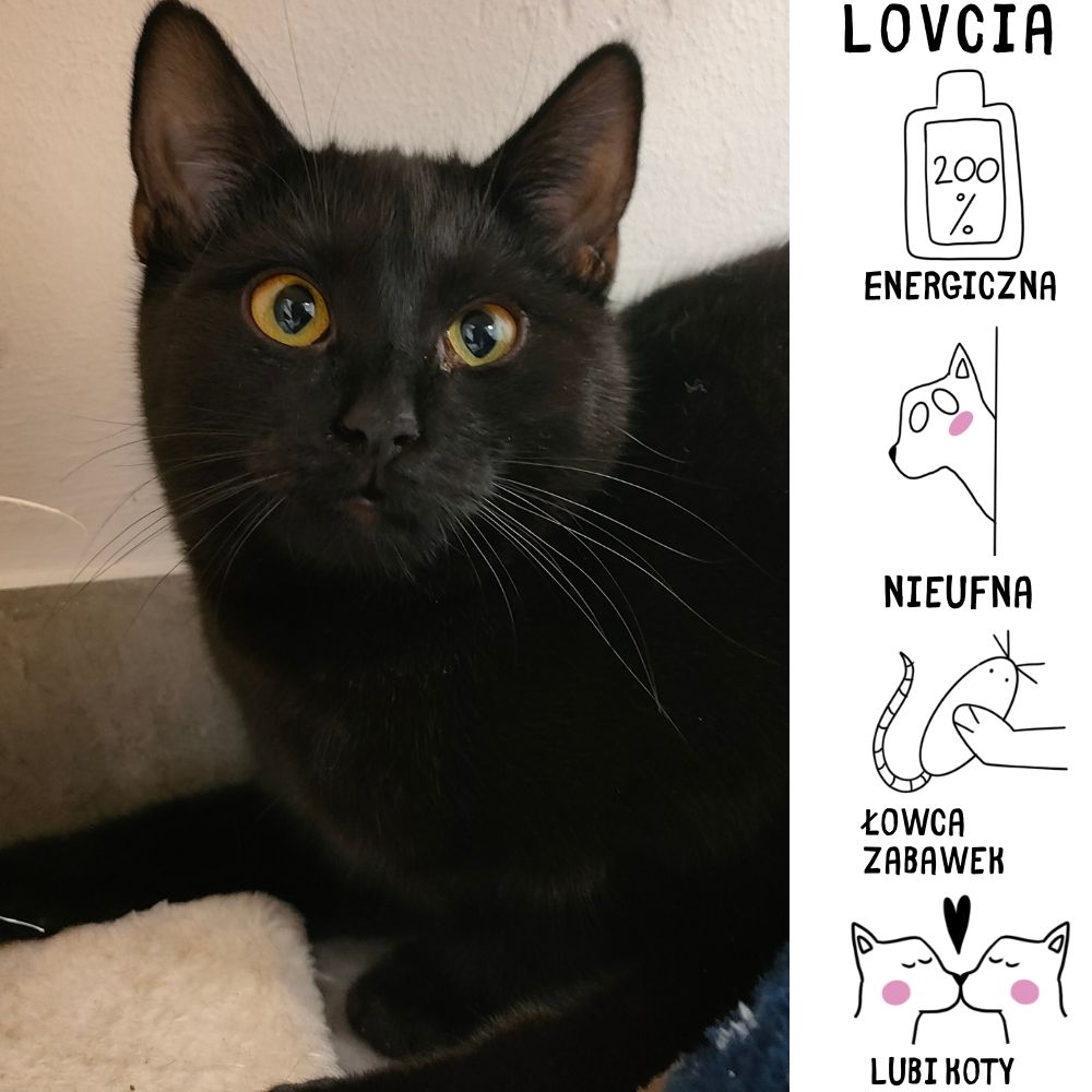 Trafiła do nas 29 września 2024 roku z ul. Św. Kamila w wieku około 2 miesięcy, była wtedy schorowana i wymagała pomocy weterynaryjnej. Po chorobie już prawie nie ma śladu, czas szukać nowej, kochającej rodzinki na całe życie. Mimo tego, że Lovcia raczej do tej pory nie znała za dobrze ludzi to coraz bardziej się do nas przekonuje, na pewno dogadałaby się z innym kotkiem. Jak każdy kociak lubi się bawić, biegać i skakać, czasem trudno za nią nadążyć. Korzysta z kuwety.