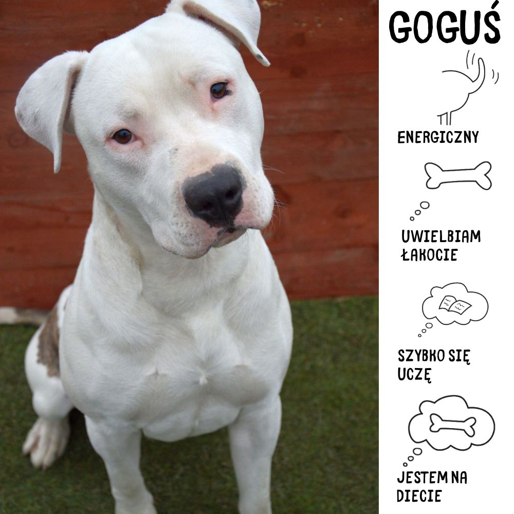 Hej! Jestem Goguś – młody amstaff pełen energii, który z przytupem wkroczył na nowe tory życia. Trafiłem tutaj po interwencji 8 listopada 2024 roku na ul. Marii Curie-Skłodowskiej, gdzie zrobiłem trochę zamieszania. No cóż, młodość rządzi się swoimi prawami, a ja mam w sobie tyle siły i zapału, że czasami trudno mi to wszystko ogarnąć. Ale czy to znaczy, że nie zasługuję na drugą szansę? Absolutnie nie!Jestem psem z potencjałem, który czeka na swojego człowieka – takiego, który rozumie, jak pracować z psami o mocnym charakterze. Mam w sobie dużo amstaffowego ducha – jestem silny, zdecydowany i wiem, czego chcę. Ale jednocześnie mam ogromne serce, które pragnie bliskości, uwagi i stabilizacji. Potrzebuję kogoś, kto pokaże mi świat w nowy sposób, nauczy, jak być grzecznym i zrównoważonym psem, i da mi przestrzeń na rozwój. Warto wiedzieć, że jestem alergikiem, więc trzeba będzie zadbać o moją dietę i zdrowie. To wyzwanie, ale w zamian mogę obiecać, że z odpowiednią opieką będę w świetnej formie i pokażę Ci, ile radości może dać wspólne życie z takim chłopakiem jak ja. Przyznaję, że w przeszłości zdarzyło mi się zachować nie tak, jak bym sobie życzył – czasami moja energia i impulsywność brały górę, przez co potrafiłem napsocić. Jednak to tylko część mojej historii, która nie definiuje mnie na zawsze. Z właściwą opieką, konsekwencją i spokojem mogę stać się oddanym przyjacielem, na którym zawsze będziesz mógł polegać.