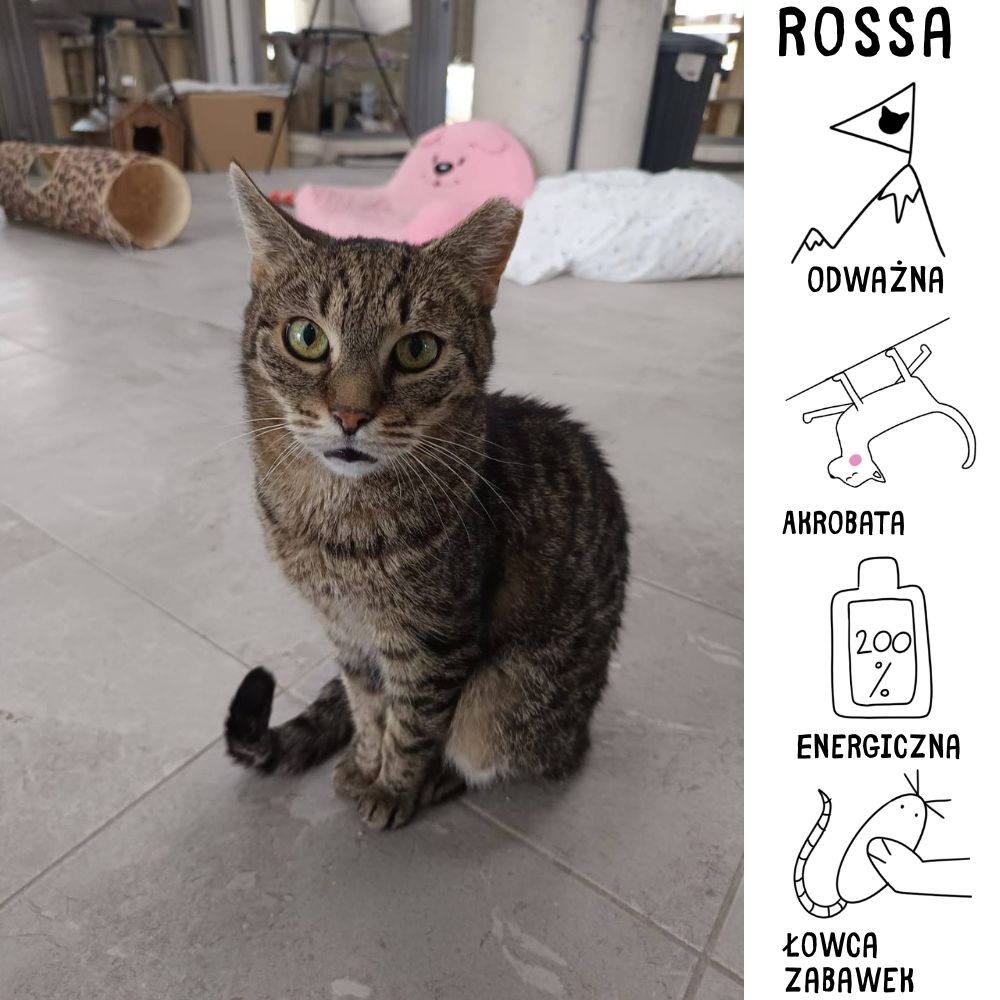 Kilkuletnia kotka, która do nas trafiła 7 grudnia 2024 roku z ul. Pokoju, gdzie pojawiła się kilka miesięcy wcześniej. Nikt nie wiedział skąd się wzięła, a całe dni i noce spędzała pod chmurką co bardzo martwiło okolicznych mieszkańców. Niestety Rossa jest wystraszona i nieufna, chociaż nie wykazuje agresji. Większość dnia spędza obserwując nas z ukrycia, miejmy nadzieję, że w końcu otworzy się :-) Korzysta z kuwety.
