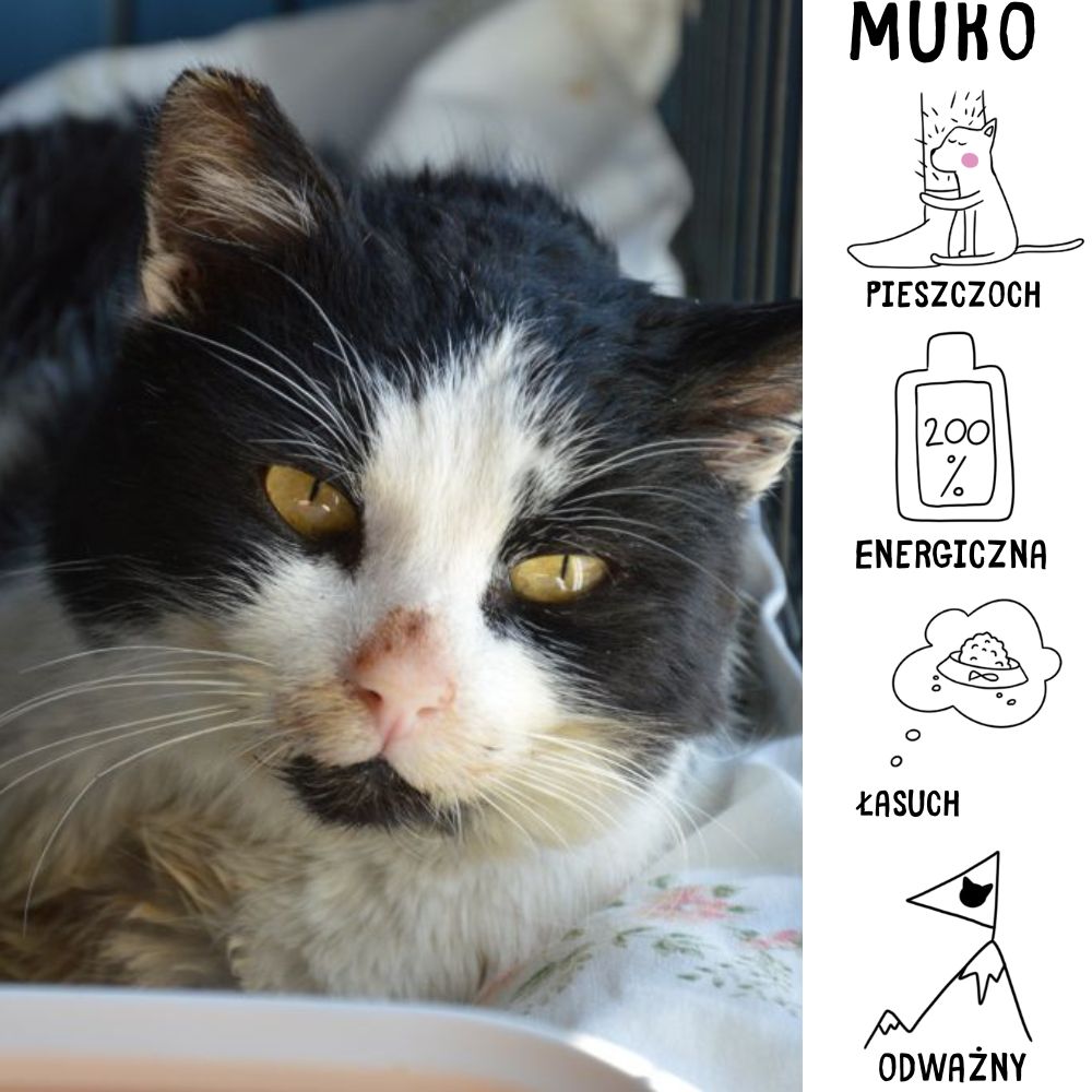 Muko to starszy kocurek, który do naszego schroniska trafił 15 stycznia 2025 roku z ul. Wolności. Był wtedy w bardzo złym stanie, dlatego przez pierwszych kilka dni przebywał w klinice weterynaryjnej. Na szczęście z każdym dniem czuje się lepiej, chociaż jeszcze wygląda kiepsko. To wyjątkowo miły kocurek, prawdę mówiąc rozkochuje w sobie wszystkich, których spotka na swojej drodze. Uwielbia się przytulać i być blisko człowieka, nie sprawia żadnych problemów. Korzysta z kuwety.