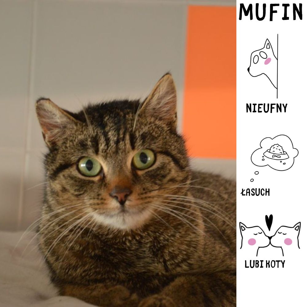 Kilkuletni kocurek, który do naszego schroniska trafił 18 stycznia 2025 roku z ul. Piekarniczej gdzie dostał się na halę jednej z firm i nie zamierzał jej opuścić. Ze względu na bezpieczeństwo kotka (pracujące tam maszyny) nie mógł tam zostać. Niestety Mufinek chyba do tej pory nie miał zbyt wiele do czynienia z ludźmi, obserwuje nas na odległość i ewentualnie kiedy jest głodny domaga się jedzonka. Natomiast koty nie robią na nim większego wrażenia, widać, że musiał mieć już wcześniej kocie towarzystwo. Korzysta z kuwety.