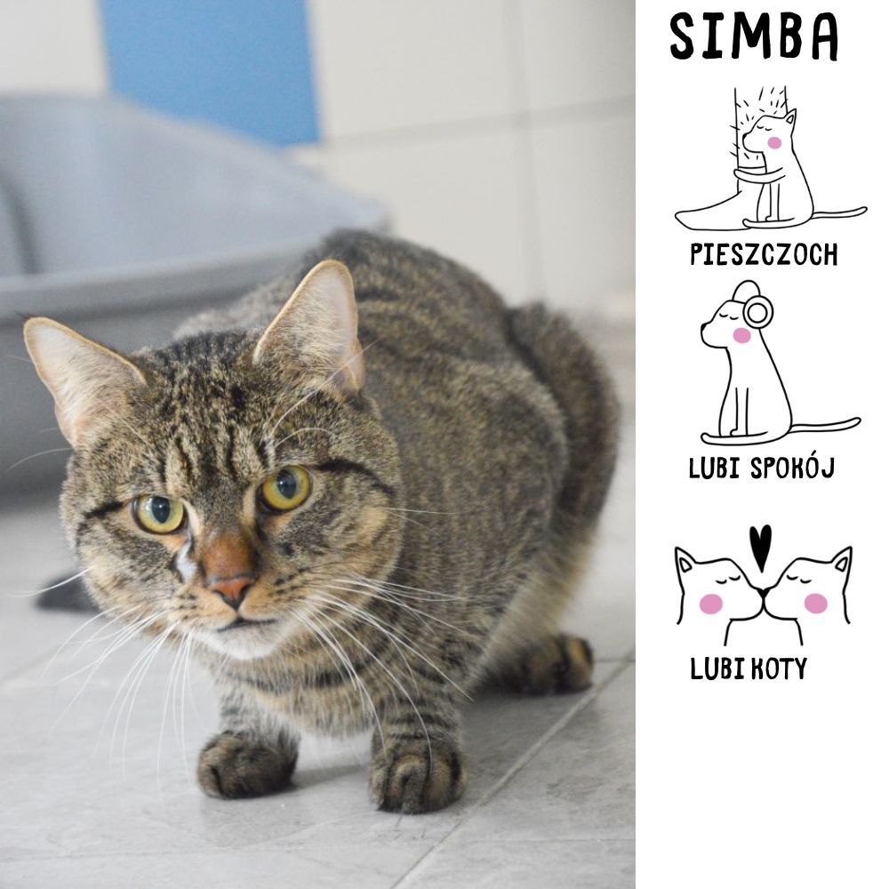 Simba, to młodziutki kocur, który do naszego schroniska trafił 16 lutego 2025 roku z ul. Klonowej gdzie przez balkon wszedł do jednego z mieszkań, podobno pojawiał się tam już od pewnego czasu. W mieszkaniu był wystraszony, ale bez problemu pozwolił się wziąć na ręce i włożyć do transporterka. Mimo naszych ogłoszeń nikt go u nas nie szukał, a to przemiły i zupełnie oswojony kotek. Jest bardzo grzeczny, niekonfliktowy - zgadza się właściwie z każdym kogo spotka na swojej drodze. Simba lubi przytulać się do swoich opiekunów, wyjątkowo lubi być też głaskany po brzuszku i za uchem :-) Korzysta z kuwety.