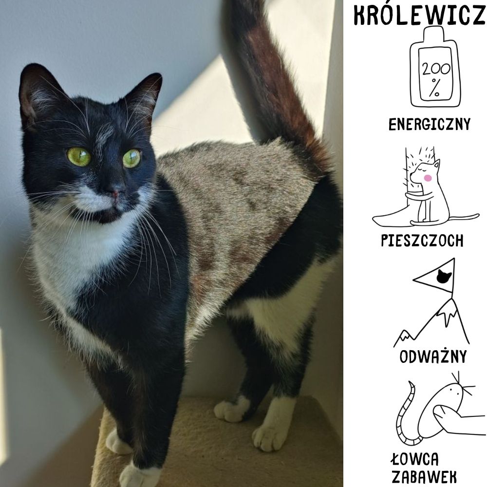 Królewicz to kilkuletni kocur, który do naszego schroniska trafił 5 maja 2025 roku z ul. Zamkowej gdzie został znaleziony, podobno nikt go do tej pory tam nie widywał. W momencie znalezienie miał ranę na nosku, dlatego kilka pierwszych dni spędził w Centrum Weterynarii. Nosek jest już prawie zagojony, więc Królewicz powoli zaczyna rozglądać się za własnym domkiem, takim na zawsze. Jest bardzo ciekawskim i energicznym kotem, musi wszędzie zajrzeć i wszystko sprawdzić. Uwielbia się przytulać, jednak też nie do przesady, bo to koci indywidualista. Chyba najlepiej czułby się w domu bez innych zwierzaków, chociaż jeszcze obserwujemy go pod tym kątem. Korzysta z kuwety.