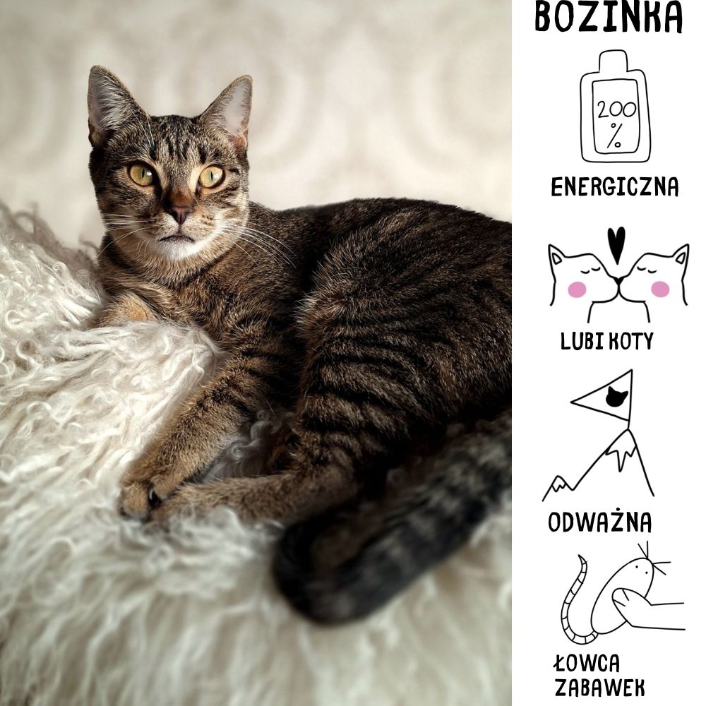 Cześć, jestem Bozinka, spokojna kotka w wieku dwóch i pół miesiąca, pochodząca z działek Wypoczynek w Zabrzu Biskupicach. Mieszkam teraz u tymczasowych opiekunów razem z moim braciszkiem Rompelkiem. Mam piękne pręgowane futerko i duże, czujne oczy, które często spoglądają z zaciekawieniem na nowe otoczenie. Jestem zaszczepiona, odrobaczona i zaczipowana, co zapewnia mi bezpieczeństwo i zdrowie. W przyszłości będę potrzebowała zabiegu sterylizacji w schronisku, ale to tylko formalność, żeby być zdrową i szczęśliwą. Idealnie nadaję się do dokocenia, bo uwielbiam towarzystwo innych kotów. Lubię się bawić, ale także cenię sobie chwile spokoju, kiedy mogę odpocząć na parapecie i obserwować świat za oknem. Jestem mała, ale mam ogromne serce pełne miłości do ludzi i innych zwierząt. Jeśli szukasz towarzysza, który będzie w stanie dodać odrobinę ciepła i radości do Twojego domu, nie musisz już szukać dalej. Może właśnie ja będę Twoim idealnym przyjacielem?