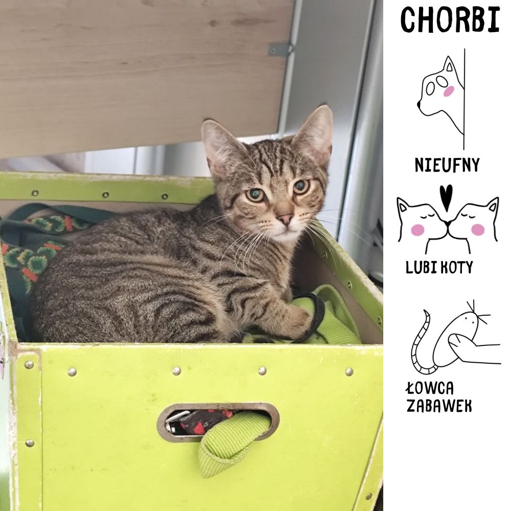 Cześć! Nazywam się Chorbi i jestem młodym kocurkiem o pięknym pręgowanym futerku. Urodziłem się w kwietniu 2025 roku, a do schroniska przybyłem z rodzeństwem w lipcu. Choć jestem trochę nieufny, potrzebuję tylko odrobiny czasu, aby się otworzyć. Doskonale dogaduję się z innymi kotami i wręcz uwielbiam się bawić. Jestem nauczony korzystania z kuwety, co na pewno ułatwi nasze wspólne życie. W schronisku dbają o moje zdrowie - jestem już zaszczepiony, odrobaczony i zaczipowany. W przyszłości czeka mnie jeszcze kastracja. Mam nadzieję, że znajdę dom, w którym będę czuł się bezpiecznie i szczęśliwie. Moja nieśmiałość to tylko pozory - daj mi szansę, a przekonasz się, jak wspaniałym mogę być towarzyszem! Jestem pełen potencjału do wspaniałej przyjaźni, wystarczy tylko odrobina cierpliwości.