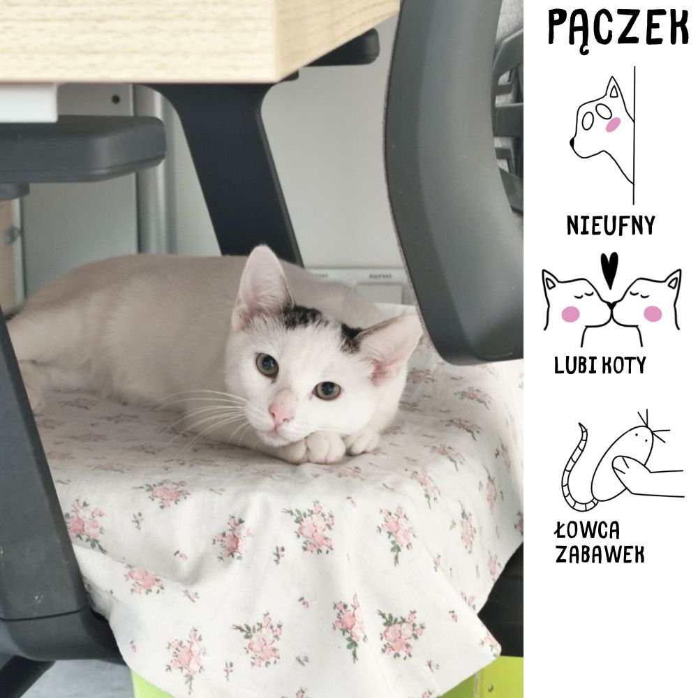 Cześć! Jestem Pączek, biały kocurek z czarnymi łatkami na głowie. Urodziłem się w kwietniu 2025 roku i do schroniska trafiłem wraz z rodzeństwem w lipcu. Na początku jestem trochę nieufny, ale kiedy już się otworzę, jestem przyjacielski. Uwielbiam patrzeć na wszystko z góry, co sprawia, że czuję się bezpiecznie. Dogaduję się z innymi kotami – razem tworzymy zgraną ekipę. Czasem po prostu lubię się bawić i rozrabiać, jak to małe kociaki mają w zwyczaju. Już opanowałem korzystanie z kuwety i czekam na dzień, kiedy będę po wykastrowaniu. Jestem zaszczepiony, odrobaczony i zaczipowany, gotowy na nowe przygody i swoją przyszłą rodzinę. Cierpliwie czekam na kogoś, kto da mi czas i miłość, których potrzebuję. Obiecuję, że za zaufanie odwdzięczę się mruczeniem i ciepłem każdego dnia.