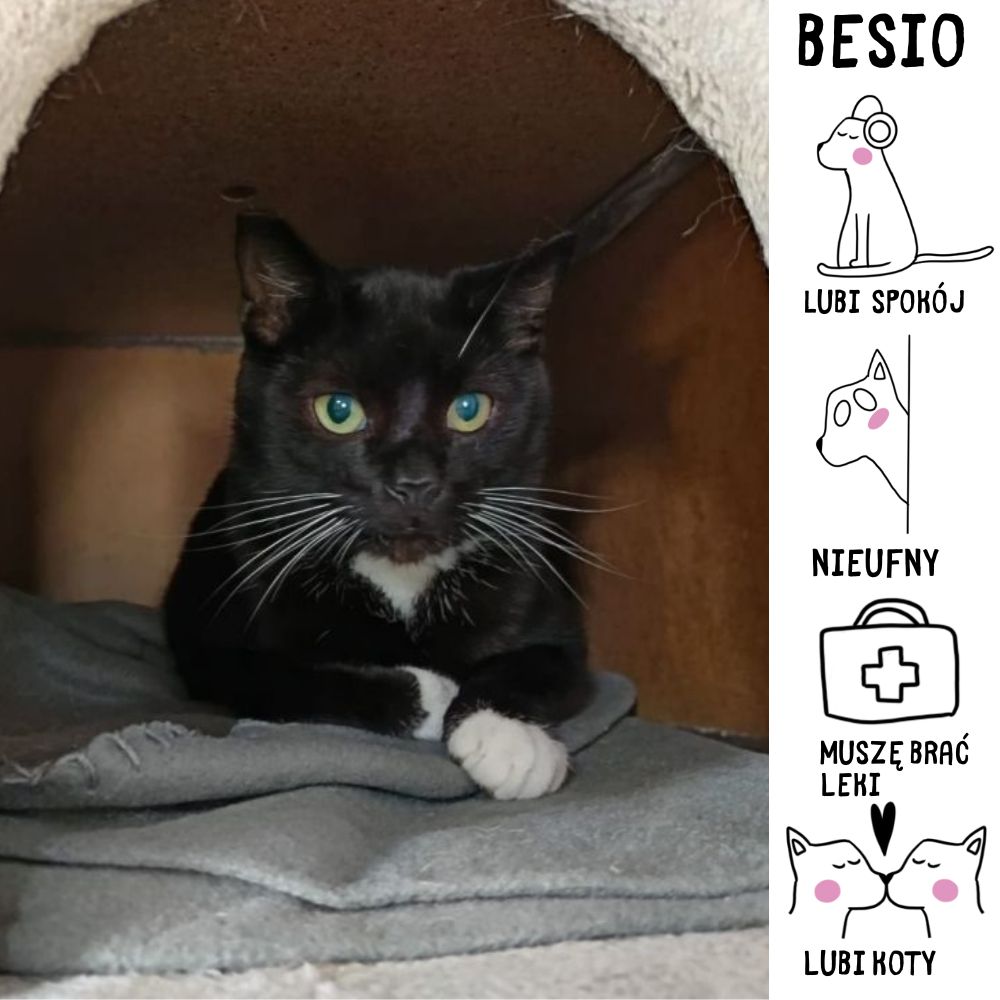 Cześć, jestem Besio. Trafiłem do schroniska 5 marca 2025 roku z ul. Beskidzkiej w bardzo złym stanie. Mam wadę serca, która wymaga, bym dożywotnio przyjmował leki. Mimo że kiedyś byłem wolnożyjący, teraz cieszę się spokojnym życiem w schronisku. Uwielbiam spędzać ciepłe dni na wolierze, a w chłodne chować się w mojej budce na drapaku. Jestem towarzyski względem innych kotów, ale ludzi trochę się boję. Korzystam z kuwety bez problemów i jestem wykastrowany. Szukam ciepłego miejsca, gdzie mógłbym spędzić resztę życia. Mimo moich obaw, wierzę, że w odpowiednim otoczeniu otworzę się na przyjaźń z człowiekiem.