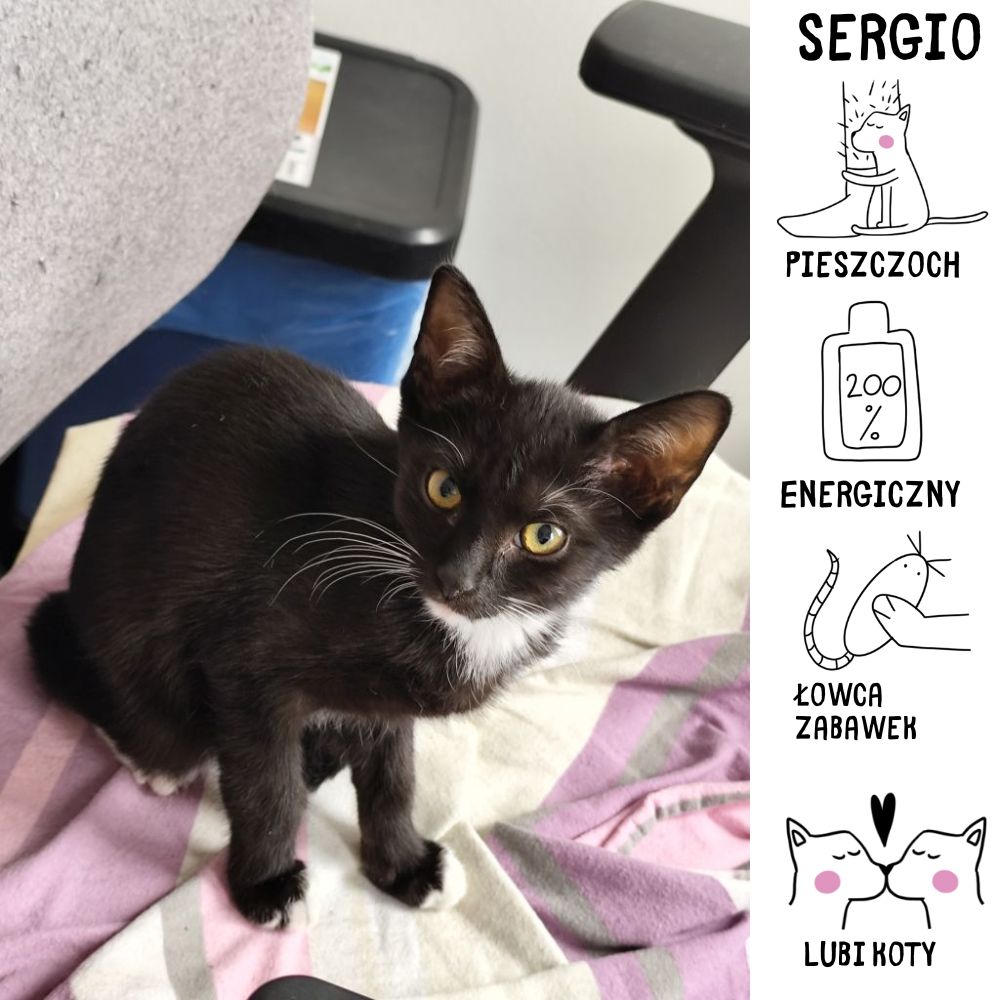 Cześć! Mam na imię Sergio i jestem ślicznym czarnym kocurkiem z białym krawatem pod szyją. Urodziłem się w drugiej połowie maja 2025 roku, a w schronisku wraz z moim rodzeństwem zamieszkaliśmy 16 lipca. Na początku byłem nieco wystraszony, ale powoli zaczynam się otwierać. Od niedawna nieśmiało wchodzę na kolana moich opiekunek i domagam się pieszczot. Każda zabawa jest dla mnie okazją do radości, a towarzystwo innych kotków jest mile widziane. Mam spokojne usposobienie, ale jak każdy młodzieniec czasem też musze poszaleć. Marzę o domu, w którym będę mógł być sobą.
