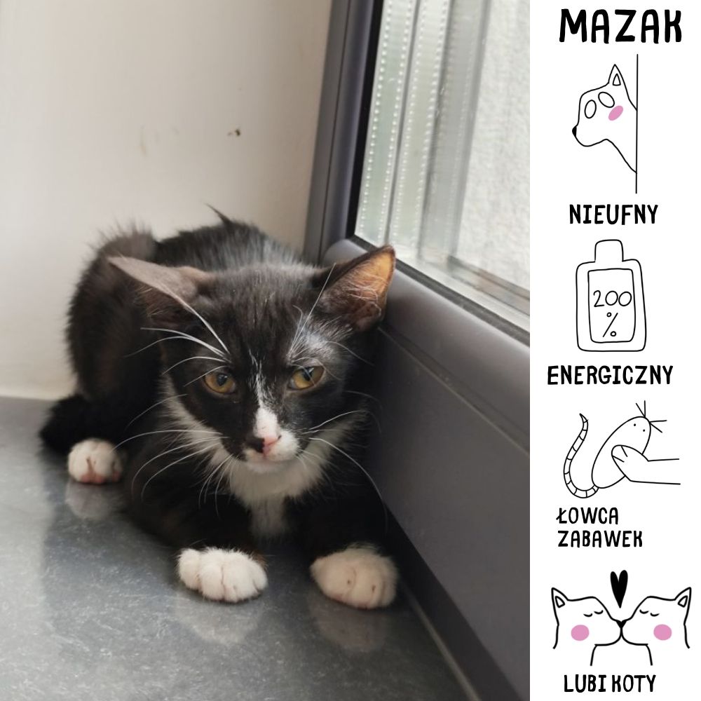 Hej, jestem Mazak, mały i energiczny kocurek, który jeszcze niedawno mieszkał na wolności z swoimi braćmi. Trafiłem do schroniska 21 lipca 2025 roku, a urodziłem się w kwietniu tego samego roku. Mam elegancki czarno-biały futerko i oczy pełne ciekawości. Mimo że początki były trudne - choroba i lęk przed ludźmi - z każdym dniem robię postępy w oswajaniu się z nowym otoczeniem. Uwielbiam bawić się z rodzeństwem i odkrywać nowe zabawki. Jestem także bardzo grzeczny i korzystam z kuwety. Już jestem zaszczepiony, odrobaczony i zaczipowany, a wkrótce czeka mnie zabieg kastracji. Szukam nowej rodziny, która pomoże mi zbudować zaufanie i pokaże, jak fascynujący potrafi być świat ludzi. Wiem, że czeka na mnie dużo przygód i ciepłych chwil, i nie mogę się doczekać, by je przeżyć wspólnie z Tobą.