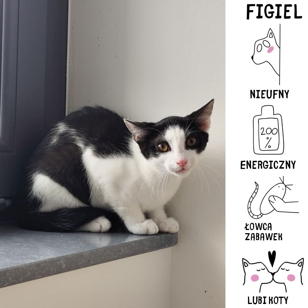 Cześć! Jestem Figiel, energiczny kocurek z biało-czarnym futerkiem, który uwielbia się bawić i przytulać do rodzeństwa. Do schroniska trafiłem 21 lipca z u. Wybickiego z dwójką braci i na początku byłem trochę nieśmiały wobec ludzi, ale z każdym dniem staje się lepiej. Na szczęście nie długo trwało moje leczenie, które trochę przeszkadzało mi w oswajaniu się, ale teraz już zdrowiej każdego dnia. Uwielbiam zabawy i odkrywanie nowych zakamarków, a gdy już wypocznę, jestem naprawdę miłym towarzyszem. Jestem zaszczepiony, odrobaczony i zaczipowany, co pozwala mi myśleć o przyszłych przygodach bez obaw. Wkrótce przejdę zabieg kastracji. Korzystam z kuwety, co na pewno ułatwi Ci życie, jeśli mnie przygarniesz. Mimo że czasami jeszcze jestem ostrożny wobec nowości, jestem ciekawskim kotem, gotowym na poznawanie świata. Potrzebuję tylko cierpliwości, miłości i szansy na zbudowanie zaufania. Wierzę, że razem możemy stworzyć wspaniałą drużynę!