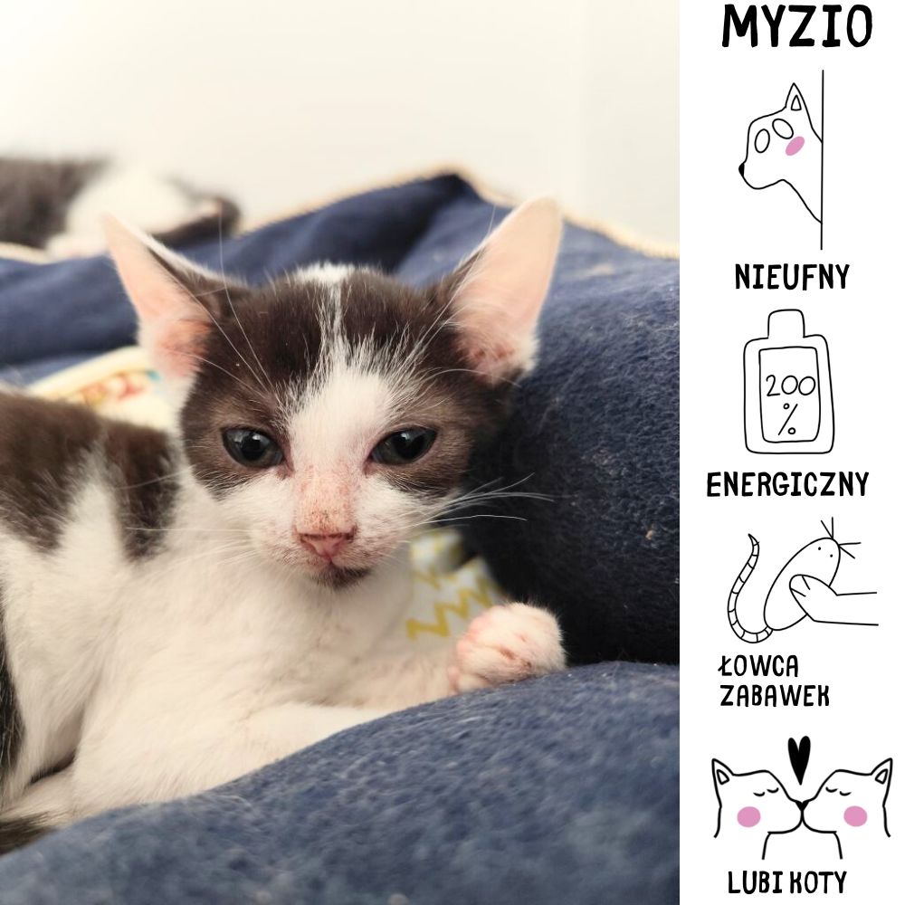 Cześć, jestem Myzio, mały kociak z białym futerkiem ozdobionym czarnymi łatkami, podobno urodą przypominam nieco sfinksa. Przyszedłem na świat na początku czerwca 2025 roku, a dokładnie 8 czerwca trafiłem do schroniska z moją mamą i rodzeństwem. Mama mimo choroby dzielnie opiekowała się nami. Jestem pełen energii i radości, uwielbiam bawić się z innymi kociakami i buszować po kątach. Chociaż czasami bywam nieco nieufny, to zawsze gotów jestem poczuć radość. Potrafię korzystać z kuwety, a już zostałem zaszczepiony, odrobaczony i zaczipowany. W przyszłości czeka mnie zabieg kastracji. Cieszę się każdym dniem i szukam ciepłego domu, który pozwoli mi na dalszy rozwój i dużo miłości.