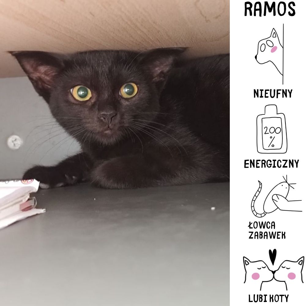 Cześć! Jestem Ramos, mały, czarny kotek o lśniącym futrze i wielkich, pełnych ciekawości oczach. Urodziłem się na ul. Gnieźnieńskiej na początku maja 2025 roku, a do schroniska trafiłem 1 sierpnia. Choć początkowo byłem bardzo ostrożny i nieufny, teraz staję się coraz odważniejszy i bardziej otwarty. Zaczynam coraz bardziej doceniać kontakt z ludźmi, choć potrzebuję jeszcze czasu, żeby w pełni zaufać. Uwielbiam towarzystwo innych kotów i świetnie się z nimi dogaduję. Potrzebuję domku, gdzie cierpliwie poczekają na moje pełne zaufanie. Jestem sprytny i lubię się chować w interesujących miejscach, co dodaje mi uroku. Moja odwaga rośnie każdego dnia, a ja coraz częściej wychylam się z ukrycia, by zobaczyć, co dzieje się dookoła. W moim nowym domu będę potrzebował spokoju i cierpliwości, ale obiecuję, że z czasem będę wspaniałym towarzyszem.