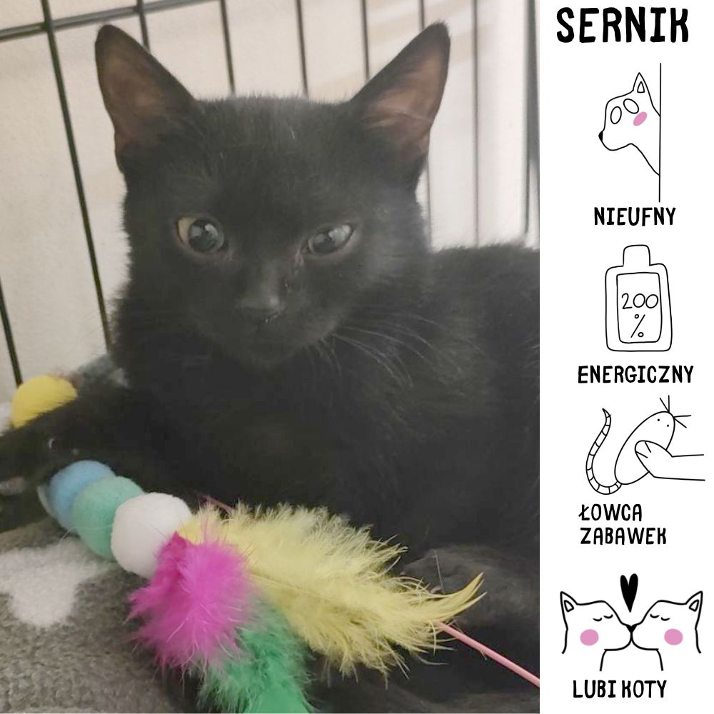 Hej, jestem Sernik – czarny kocurek, urodzony prawdopodobnie w czerwcu. Do schroniska trafiłem 13 września 2025 roku razem z moją siostrą Grzanką. Byliśmy wtedy bardzo chorzy i osłabieni, ale dzięki troskliwej opiece szybko wracamy do formy. Na początku mogę być trochę nieśmiały – świat bywa przecież wielki i głośny! Ale kiedy już kogoś poznam, pokazuję swoją prawdziwą naturę: jestem wesołym, energicznym i ciekawskim maluchem, który uwielbia zabawę. Lubię też towarzystwo innych kotów – w ich obecności czuję się pewniej i odważniej. Korzystam z kuwety, jestem zaszczepiony, odrobaczony i zaczipowany, a w przyszłości trzeba będzie zgłosić się ze mną do schroniska na bezpłatny zabieg kastracji.