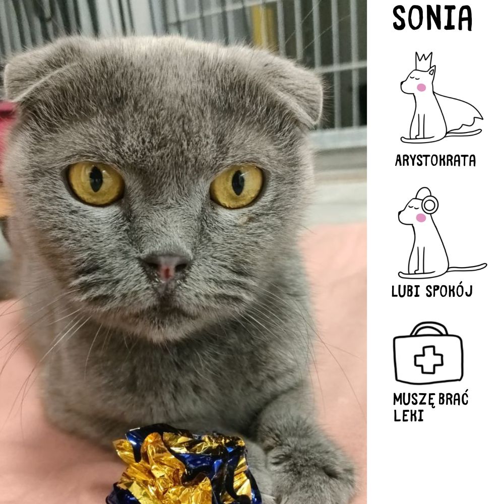 Cześć! Jestem Sonia, urocza kotka rasy szkocki zwisłouchy o pięknych złotych oczach. Moja historia zaczęła się na Ukrainie, gdzie przyszłam na świat w 2013 roku. Przeprowadziłam się do Polski z moją rodziną, by razem cieszyć się nowym życiem. Niestety, los bywa kapryśny. Po pewnych perturbacjach, znalazłam się w schronisku po raz pierwszy 30 lipca 2023 roku w wyniku interwencji Policji. Wkrótce jednak wróciłam do mojej opiekunki. Niedawno, 23 września 2025, ponownie znalazłam się na ulicy, głodna i schorowana. Moja opiekunka już nie mieszkała pod dawnym adresem, a jej telefon nie odpowiadał. Jestem starszą kotką, która potrzebuje specjalnej troski. Miewam różne humory – czasami z radością przychodzę po pieszczoty, a czasem potrafię pokazać pazurki. Korzystam z kuwety, ale wymagam regularnych wizyt u weterynarza, aby zadbać o moje zdrowie. Już jestem odrobaczona i zaczipowana, a wkrótce, kiedy poczuję się lepiej, zostanę zaszczepiona i wysterylizowana. Szukam spokojnego domu, gdzie będę mogła spędzić moje złote lata w odpowiedniej opiece.