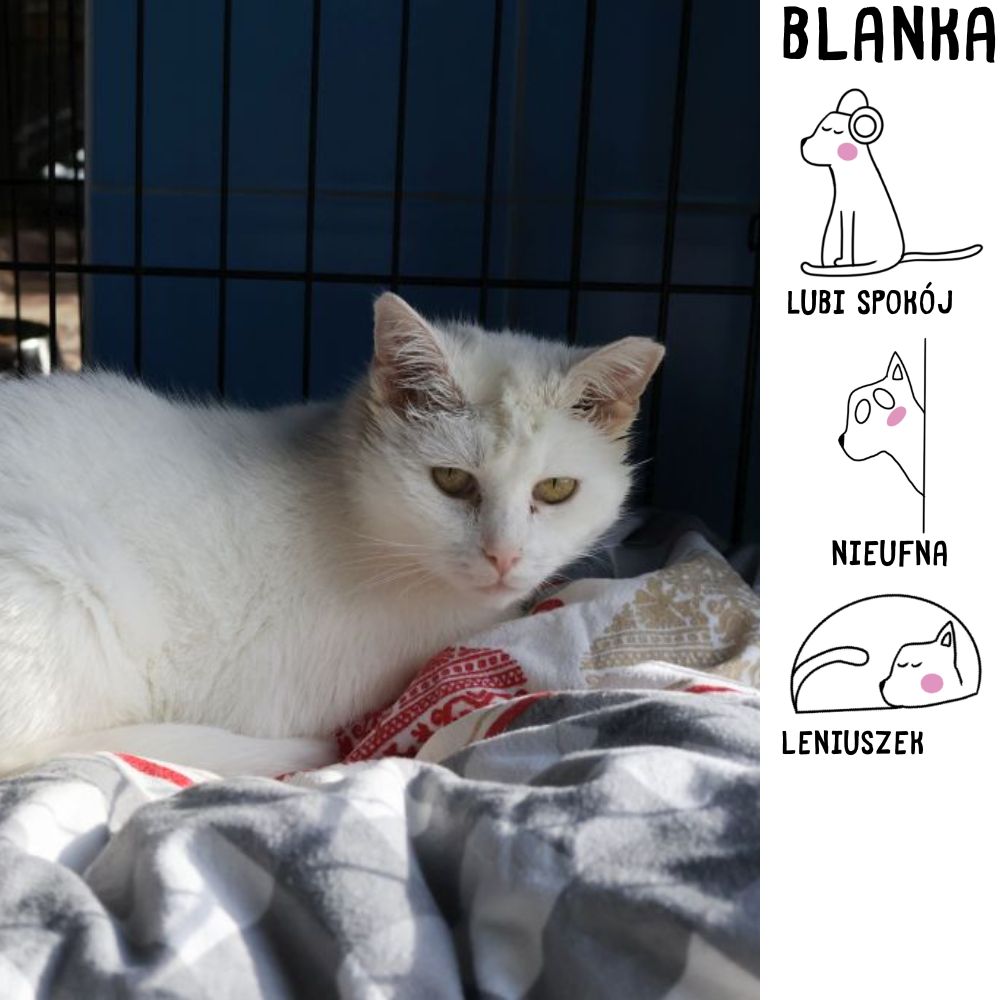 Nazywam się Blanka i jestem starszą, spokojną kotką. Do schroniska trafiłam 7 lipca 2025 roku z ulicy Żnińskiej – byłam wtedy w złym stanie zdrowia. Przez większość życia byłam kotką wolno żyjącą, ale po poważnym zabiegu, który przeszłam, nie mogłam już wrócić na ulicę. Teraz szukam bezpiecznego domu, w którym będę mogła spędzić spokojne dni. Jestem oswojona i miła, dobrze dogaduję się z innymi kotami. Najbardziej lubię ciszę, miękkie posłanka i ciepłe promienie słońca, w których mogę się wylegiwać godzinami. Z kuwety korzystam bez problemu, a zabieg sterylizacji mam już za sobą.