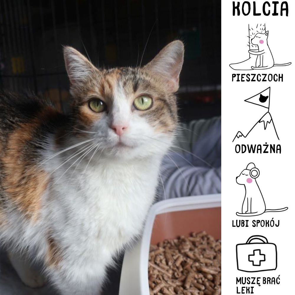 Cześć! Mam na imię Kolcia. Moja historia może nie zaczyna się najlepiej, bo jestem kotką, która została znaleziona na ulicy Nowodworskiej, gdzie podążałam za dziećmi wracającymi z przedszkola. Trafiłam do schroniska 5 listopada 2025 roku, pełna nadziei na lepsze jutro. Jestem kilkuletnia i mimo trudności, jakie napotkałam, staram się być jak najbardziej pogodna i przyjazna. Moją siłą jest ogromna chęć do życia i pozytywne nastawienie, które pomaga mi przetrwać chwilowe trudności. Uwielbiam towarzystwo innych kotków i porządnych ludzi. Korzystam z kuwety, co czyni mnie czystą i dobrze wychowaną koteczką. Moje zdrowie wymaga jeszcze trochę uwagi, potrzebuję opieki weterynaryjnej, aby wrócić do pełni sił. Schroniskowy zespół bardzo o mnie dba, a ja odwzajemniam się im swoim wdzięcznym mruczeniem. Marzę o tym, by znaleźć kochającą rodzinę, która da mi bezpieczny i ciepły dom. Jestem dzielna i wierzę, że wszystko ułoży się dobrze. Kocham życie i z niecierpliwością czekam na nowe przygody, których z pewnością będzie wiele, gdy tylko dołączę do nowej rodziny. Jestem gotowa na miłość i czułość, którą z radością odwzajemnię. Daj mi szansę, a razem stworzymy wspaniały duet!