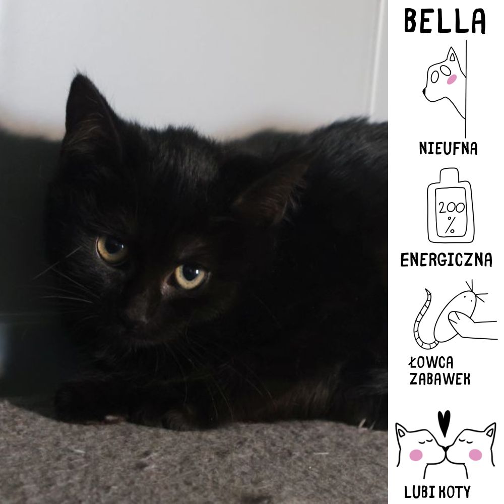 Dzień dobry, jestem Bella – czyli Piękna, choć może bardziej pasuje do mnie charakter niż wygląd. Dostałam to imię, bo jestem ponoć najbardziej „dostojna” z sióstr… cokolwiek to znaczy u małego kociaka, który właśnie pogonił własny ogon.