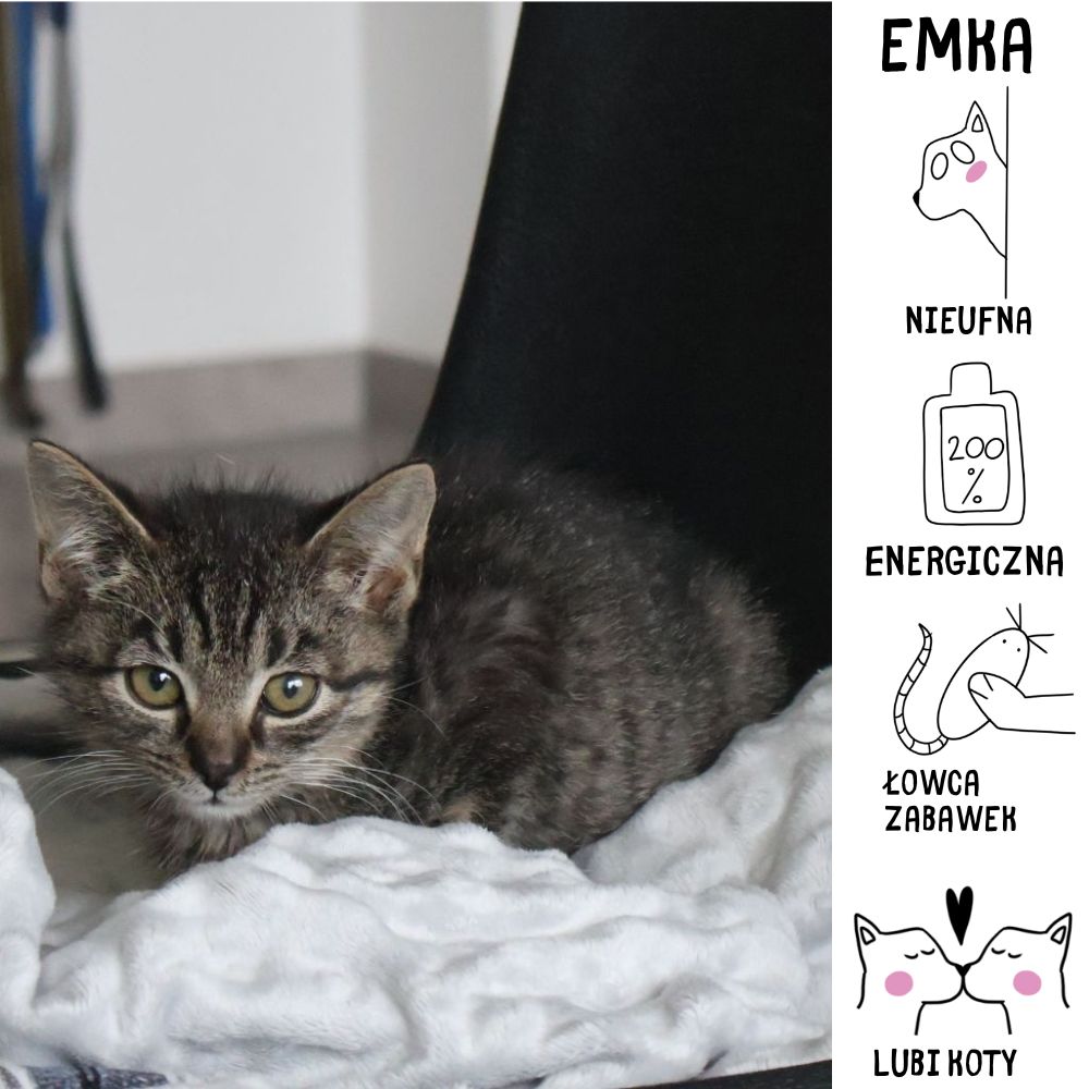 Hej, tu Emka! Razem z rodzeństwem trafiłam do schroniska 7 października 2025 roku z ul. Tatarkiewicza. Jestem jeszcze młodą, wrześniową koteczką, która dopiero odkrywa, że ludzie wcale nie są tacy straszni. Każdego dnia otwieram się coraz bardziej – czasem podchodzę, żeby powąchać rękę, czasem pozwalam się pogłaskać, a czasem po prostu obserwuję z boku. Za to przy innych kotach czuję się jak rybka w wodzie! Uwielbiam wspólne gonitwy, zabawy i przytulanie się do mojego rodzeństwa.