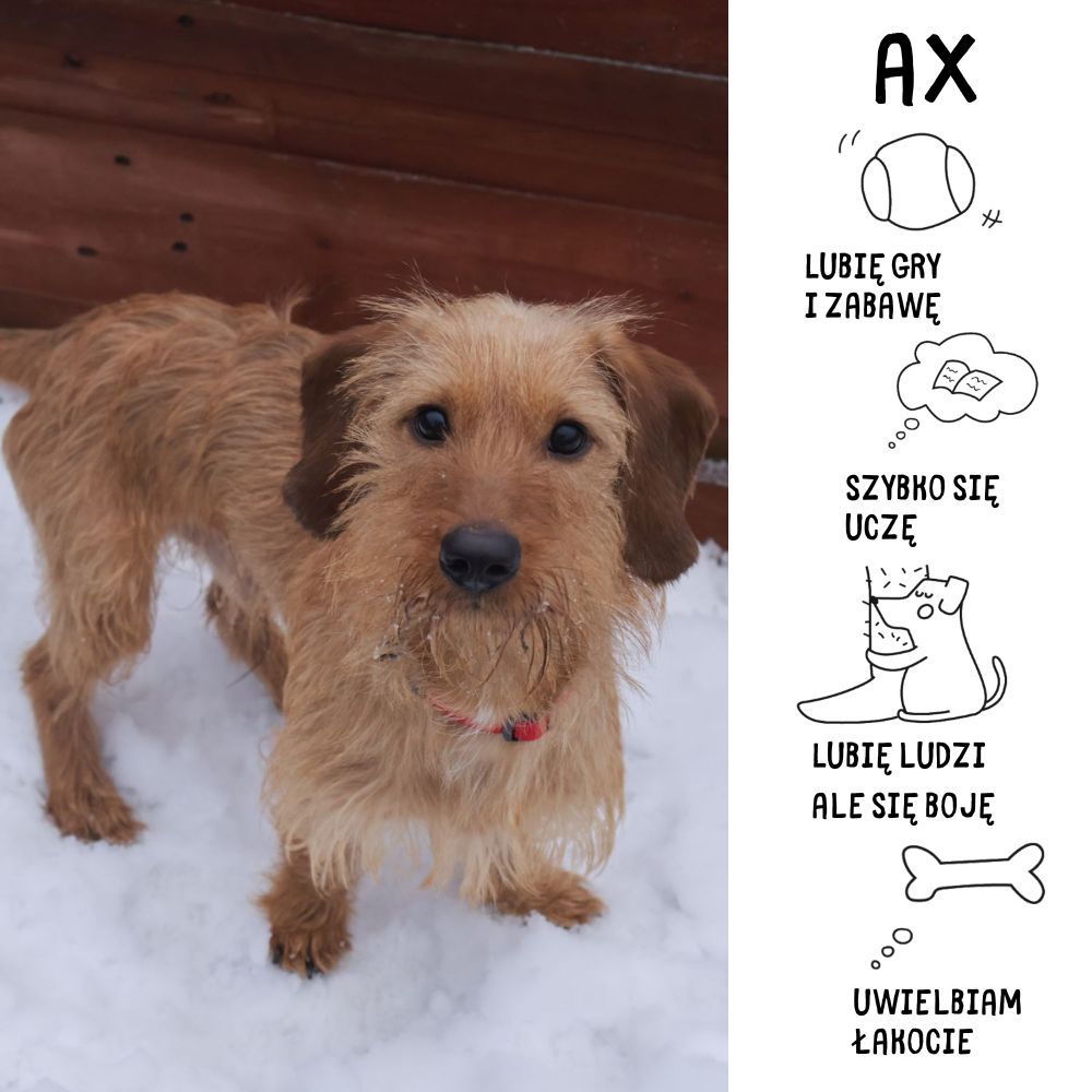 Cześć. Jestem Ax. Jestem małym, młodym psiakiem w typie jamnika szorstkowłosego. Do schroniska trafiłem 26 listopada 2025 roku, wcześniej przebywałem u osób, które znalazły mnie błąkającego się po centrum Zabrza. Zrobiły ogłoszenie ale pozwolili mi zostać u nich. Niestety nie potrafię dogadywać się z dziećmi, a mój właściciel jak go nie było tak go dalej nie ma. Z bólem serca ale musieli mnie dać do schroniska. Okazałem się psem, który boryka się z pewnymi problemami jak np.: ( niewypracowany lęk separacyjny), szczekliwość wynika z mojej rasy jednakże nie działa na moją korzyść, być może bronienie zasobów chociaż to miało miejsce jedynie na początku gdy nie ufałem. Bardzo powoli nabieram zaufania do nowych ludzi. A z tych fajnych rzeczy:) to jestem mega zabawowy, posłuszny, uwielbiam się przytulać i całować...ups.! Kiedy już zaufam można ze mną góry przenosić. Odporny jestem na relację z innymi psami, nie szukam ani sympatii ani konfliktów. Posiadam aktualne szczepienia, odrobaczenia. Niebawem czeka mnie zabieg kastracji. A po tym mam nadzieję, na fajny dom.. To jak? Wypełnisz ankietę ? Axiu prosi, ładnie :)