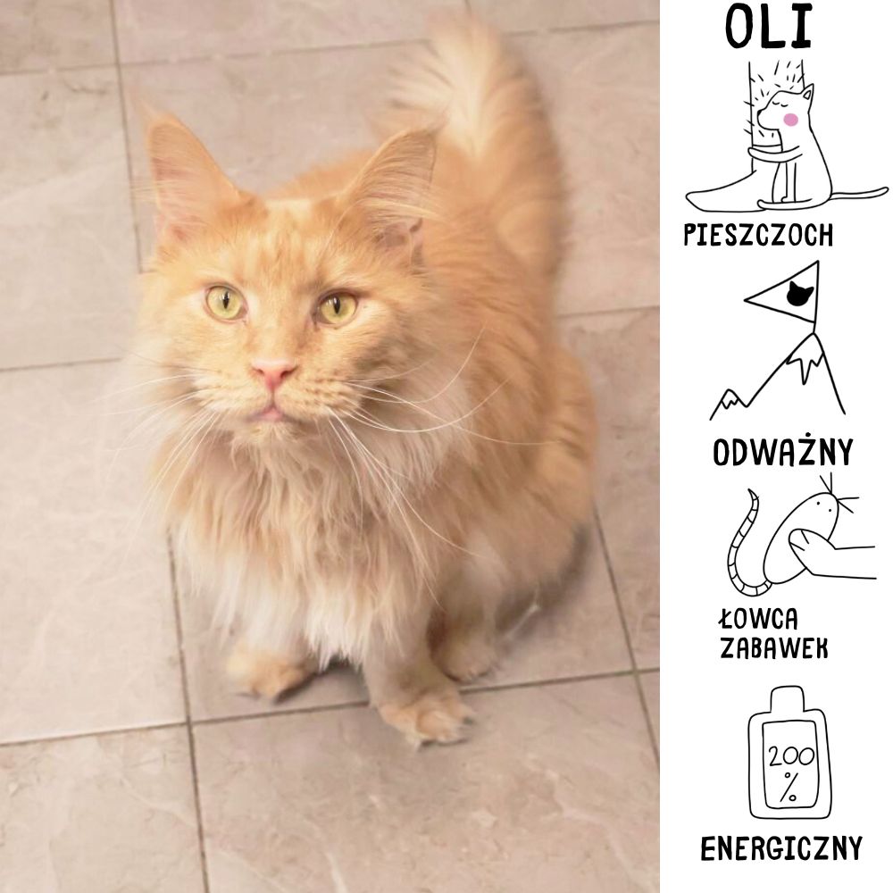 Jestem 4-letnim kocurkiem rasy Maine Coon – dużym, puchatym i całkiem dumnym ze swojej imponującej grzywy. Jak to Maine Coon, mam też charakter i własne zdanie. Do schroniska trafiłem 25 grudnia 2025 roku z ul. Bytomskiej. Moja opiekunka bardzo mnie kochała i tak naprawdę chciała pracować nad moimi problemami. Niestety reszta domowników nie była już na to gotowa i po kolejnej wpadce – kiedy zasikałem dwa nowe łóżka wylądowałem w Psitulu. W schronisku nie przejawiam takich zachowań, dlatego możliwe, że przyczyna była behawioralna – związana ze stresem albo sytuacją w domu. Mimo wszystko opiekunowie w schronisku podeszli do sprawy bardzo poważnie i rozpoczęli moją diagnostykę. Wiemy już, że będę wymagał operacji biodra. Zabieg trochę się opóźnił, bo przechodziłem infekcję, ale wszystko jest pod kontrolą i jestem pod dobrą opieką.