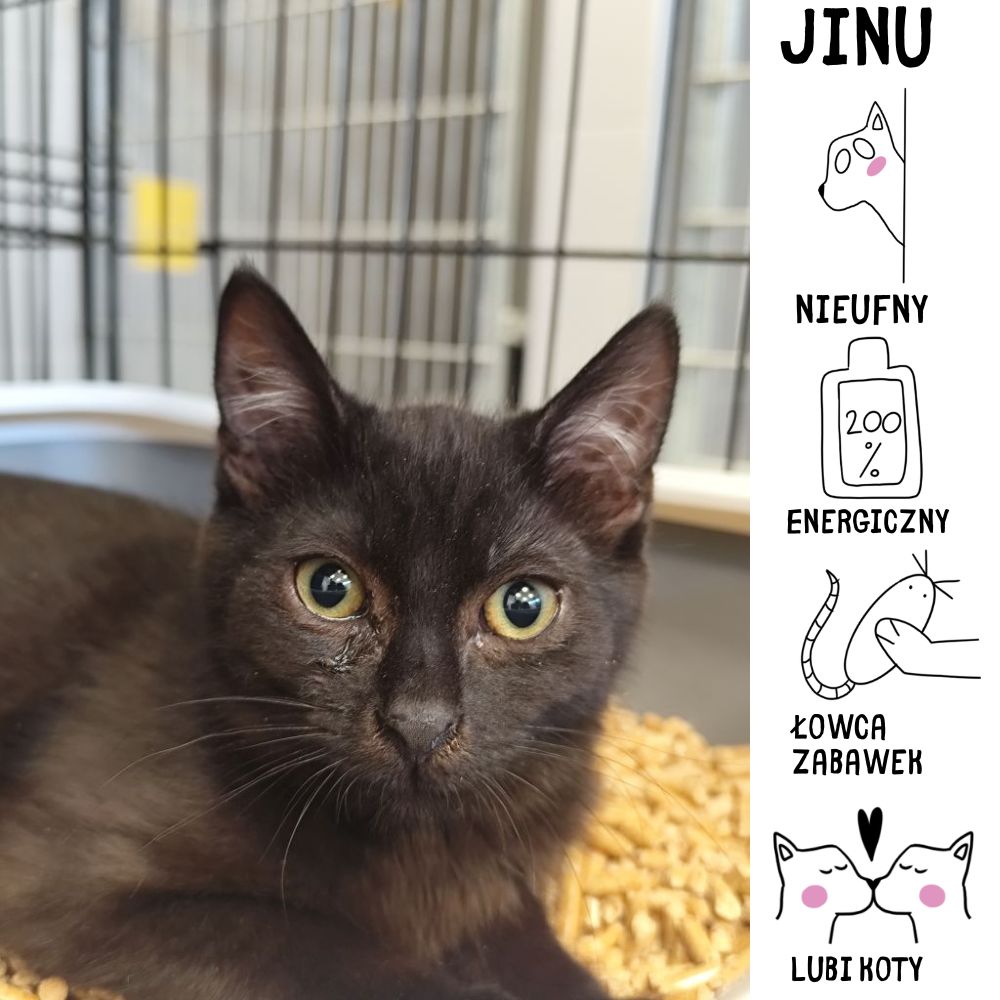 Cześć! Jestem czarnym kotkiem o imieniu Jinu. Urodziłem się w grudniu 2025 roku i trafiłem do schroniska ze swoją siostrą 1 marca 2026 roku. Znaleziono nas w garażu na ulicy Wyszyńskiego. Na początku nie znałem życia z ludźmi i trochę się ich obawiałem, ale staję się coraz odważniejszy. Bardzo lubię się bawić, jestem ciekawski i pełen energii. Potrafię korzystać z kuwety, a także jestem zaszczepiony, odrobaczony i zaczipowany. W przyszłości czeka mnie zabieg kastracji. Moja mocna strona to chęć do zabawy i szybkie przystosowanie się do nowych warunków, choć nadal potrzebuję pomocy, aby w pełni zaufać ludziom. Mam wiele potencjału, by stać się wspaniałym towarzyszem.