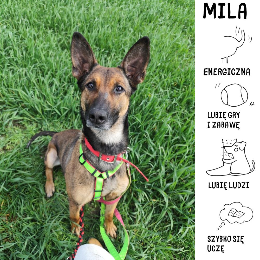 Cześć, nazywam się Mila, jestem suczką w typie rasy owczarek belgijski urodzoną w 2019 roku. W schronisku znalazłam się 15 marca 2026 r. biegałam wówczas po terenie przedszkola przy ul. Matejki. Byłam chuda i zaniedbana, jak można było się spodziewać nikt mnie nie szukał, chociaż w schronisku szybko ustalono moje pochodzenie. Nie byłam do tej pory dobrze traktowana, mieszkałam w budzie na łańcuchu co jest niedopuszczalne, ale dla psa o moim temperamencie było szczególnie okrutne. Jestem pełna energii i bystra, co jest cechą charakterystyczną mojej rasy. Owczarki belgijskie to psy bardzo szybkie, inteligentne, lojalne i chętne do nauki, potrzebujące dużo aktywności fizycznej. Chociaż jestem przyjazna w stosunku do ludzi, nie dogaduję się dobrze z innymi zwierzętami oraz małymi dziećmi. Idealny dom dla mnie to taki, gdzie będę jedynym zwierzęciem. Potrzebuję dużo uwagi, zabawy, spacerków oraz aktywności umysłowej, aby spełnić swoje potrzeby.